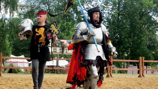 В нем приняли участие Ник Крауз, Валентин Белоусов, Илья Пфеффер, Илья Есик, Кирилл Рифкин и Андрей Богданов. Перед началом боя герольд напомнил ряд турнирных правил, которые должны были неукоснительно соблюдать выходящие на поединок бойцы. На поле, как и всегда, вышли судьи во главе с маршалом, служители поля, а затем и Суд Дам. Последних артистично приветствовали шуты, кланяясь едва ли не до земли и выражая свое восхищение происходящим громкими приветственными криками. На пешем латном турнире можно было работать как рубящими, так и колющими ударами. Боец сражался на ристалище на четырех видах оружия: копье, полэкс (топор, боевой молот и пика в одном предмете), меч и булава со щитом. Несмотря на азарт и конкуренцию, выходящие на поединок бойцы придерживались рыцарского кодекса поведения, уважительно относясь к сопернику и идя ему навстречу в затруднительных ситуациях. Так, бойцы позволяли соперникам поднимать выбитое из руки оружие (хотя формально могли бы и настоять на своей победе), давали передышку, если удар оглушал противника. Был также и случай, когда один из бойцов, выйдя на последний, четвертый раунд, который должен был состояться на булавах, понял, что локти его доспеха не оставляют ему возможности надеть щит. Оценив ситуацию, его противник сразу же согласился сражаться исключительно на булавах, отложив щит в сторону. Первый бой состоялся между Ником Крауз и Валентином Белоусовым. Победитель, Ник Крауз, получил дополнительное очко от Суда Дам. Напомню, что прекрасные дамы, входящие в состав Суда дам Турнира Святого Георгия, имели право наградить какого-либо из участников призовым очков за проявленные доблесть, рыцарственность, смелость, куртуазность. Второй бой, участниками которого стали Илья Пфеффер и Кирилл Рифкин, окончился поражением последнего. Причем Кирилл в мечевом бою проиграл вовсе не по очкам. Ему засчитали поражение потому, что он нанес противнику во время схватки на мечах удар ниже пояса, что было строго запрещено правилами турнира. И в результате победителем боя стал Илья Пфеффер. Третий бой, состоявшийся между Ильей Есиком и Андреем Богдановым (одним из сильнейших участников пешего латного турнира), порадовал зрителей своими бурностью и напором. Во время поединка на мечах, третьим после сражений на копьях и полэксах, Андрей начал такое ярое наступление на противника, что уронил его, проломив тем ристалище... после чего бой был временно приостановлен до починки огражения служителями поля. Надо сказать, что после поединка Богданов получил призовое очко от Суда Дам - видимо, прекрасные дамы также впечатлились техникой его боя. Четвертый бой между Валентином Белоусовым и Ильей Пфеффером был менее жарким, однако позволил Валентину продемонстрировать свою отличную физическую форму не только во время битвы. Из-за попавшего на ристалище мелкого песка Белоусов поскользнулся и фактически сел на пол, но почти сразу же с неожиданной от закованного в латы бойца гибкостью поднялся на ноги и битва продолжилась. Он и вышел победителем. Пятый бой, в котором участвовали Илья Есик и Кирилл Рифкин, также отличился парой примечательных моментов. Илья, по заверению герольда, наносил прямо-таки показательные удары, чтобы судьи могли как следует оценить его мастерство... и умудрился сломать о соперника полэкс. Шестой бой, з