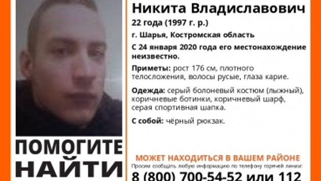 В Костромской области разыскивают 22-летнего Никиту Владиславовича Соловьева – сообщает поисковый отряд «Лиза Алерт». Молодой человек живет в городе Шарье. 24 января он ушел из дома и не вернулся. Молодой человек живет вместе с родителями. В день исчезновения он не сказал, куда направляется. Больше о его местонахождении ничего неизвестно. Раньше он никогда не исчезал, поэтому родители бьют тревогу, - рассказали нам в «Лиза Алерт». Приметы Никиты Соловьева: Рост 176 сантиметров, плотного телосложения, русые волосы, карие глаза. В последний раз его видели одетым в серый лыжный болоньевый костюм, коричневые ботинки, коричневый шарф, серую спортивную шапку. Всех, кто знает о местонахождении молодого человека, просят сообщить по телефонам: 8 800 700 54 52 или 112.