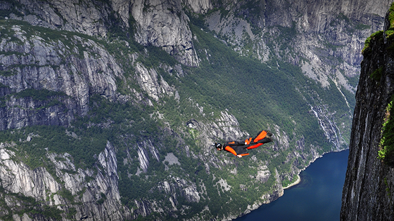 С изобретением вингсьюта прыжок наполнился новым смыслом. Шаг, сделанный с обрыва, стал началом полета, а не падения. Появление вингсьюта — это нечто большее, чем просто изобретение нового костюма. Прыжок наполнился новым смыслом. Шаг, сделанный с обрыва, стал началом полета, а не падения. Стремительно планировать вниз, управляя полётом. Только вдумайтесь: вы летите, и у вас есть только то, что на вас надето, никаких дополнительных приспособлений. Разогнаться до 200 км/ч без машины и даже без мотоцикла, разогнаться, не падая как шкаф, а летя вперед, обгоняя птиц, огибая верхушки деревьев, повторяя рельеф горных ущелий. Пролететь в полуметре от водопада, оставив внизу за ограждениями туристов с открытыми ртами. Первое правило клуба Говорить об экстремальности наверняка будет лишним. Полеты в вингсьюте, да и сам парашютный спорт в любом виде, отделены трудно пробиваемым барьером непонимания, страха и толщи мониторов, через которые мы за всем этим привыкли наблюдать. В статье «Как прийти в бэйс» от одного профессионального скайдайвера, пункт «купите бэйс снаряжение» стоит очень далеко от начала списка. Из-за высоких скоростей и возможности управлять своим полётом бёрд-мэнов называют вингсьют-пилотами, пилотами собственного тела. Как с фотоаппаратом не получится. Это тот самый случай, когда от момента увлечения до реальных тренировок и практики проходит очень много времени, а 99% «увлеченных» отсеиваются по разным причинам еще на самых ранних стадиях. Вся несерьезность и тем более пьяный угар, если они каким-то чудом попали в этот спорт, очень быстро улетучиваются. Да и само слово «спорт» здесь употреблять неуместно: прыжки в вингсьюте со скал можно сравнить, пожалуй, с фридайвингом, где риск — не цель, а неотъемлемая составляющая. Нет права на ошибку, каждая секунда на счету, есть только ты и чужая стихия, и твое благополучное возвращение на землю всегда под вопросом. Затяжное приземление Девять жизней Самые безумные прыжки известного российского бейсджампера Валерия Розова Со временем и возможности летать человеку стало мало, и вот новая заветная цель — приземление без парашюта. Над этим вопросом серьезно размышляют многие спортсмены и ученые не первое десятилетие. Одним из первых перестал размышлять и начал действовать Джеб Корлисс (Jeb Corliss). Сказать, что этот человек — бэйс-джампер, это не сказать практически ничего. В списке объектов, с которых он прыгал, все самые высокие искусственные неровности нашей планеты. Как вингсьют-пилота, вы наверняка его тоже знаете. Человек в черном — герой самых захватывающих вингсьют-видео. Корлисс — автор проекта «Приземление в костюме-крыле» (Wingsuit Landing Project) суть которого — строительство посадочной полосы с крутым уклоном, куда пилот сможет благополучно приземлиться. С точки зрения физики этот проект вполне реален, что подтверждают ученые Калифорнийского университета. Если угол траектории пилота по отношению к горизонтали совпадет с наклоном пандуса, и силу трения удастся довести до минимума, удар при касании посадочной полосы будет практически не ощутим. Вся сложность заключается именно в правильном угле приземления: при отклонении всего на 15 градусов, удар будет сопоставим с падением с высоты 10 метров на асфальт. Но, как ни странно, для реализации проекта сейчас не хватает именно денег. П