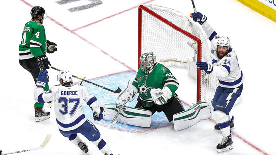 Худобин старался как мог, но ничего не сумел сделать. В воскресенье Кубок Стэнли может найти своего обладателя. Четвёртый матч финала Кубка Стэнли многими заокеанскими обозревателями логично считался ключевым для определения исхода всей серии. Во второй и третьей игре «Тампа» смогла заполучить все нити управления финалом в свои руки, а «Даллас» сбился на недисциплинированную игру. Возможность на равных бороться начала ускользать от техасцев, а плюс ко всему, актуальным стал и вратарский вопрос, поскольку для уставшего Антона Худобина было бы непросто играть два матча за два дня. Худобина не винили за поражения в финале, но отмечали, что серию против «Вегаса» россиянин провёл на невероятно высоком уровне и стал главной причиной попадания «Старз» в финал. «Никто не вернёт «Даллас» в эту серию быстрее, чем Антон», — говорил перед четвёртой встречей обозреватель NBC Sports Адам Грец, добавляя, что многое зависит и от захандрившего первого звена «звёзд». Началось всё для «Далласа» необычайно здорово — команда Рика Боунесса сумела повести с перевесом в две шайбы, нанеся за первый период только 3 броска в створ. Первым отметился защитник Джон Клингберг, чей бросок со средней дистанции стал откровением для вратаря «Лайтнинг» Андрея Василевского, а ближе к перерыву отличились и критикуемые лидеры «Далласа». Александр Радулов неплохой передачей запустил по левому флангу Джейми Бенна, тот переадресовал шайбу в центр, где Джо Павелски не сплоховал и забил свой 11-й гол в плей-офф. Права на видео принадлежат ООО «Яндекс». Посмотреть видео можно на сайте «Яндекс.Эфир». Однако «молнии» не были бы главным претендентом на Кубок Стэнли, если бы дали сопернику оторваться и «засушить» игру. Не успел диктор по стадиону как следует объявить шайбу Павелски, как Брейден Пойнт, получив отменный пас на ход от Ондржея Палата, вышел один на один и не оставил шансов Худобину. Права на видео принадлежат ООО «Яндекс». Посмотреть видео можно на сайте «Яндекс.Эфир». В начале второго периода у «Старз» сплоховал защитник Джейми Олексяк, который не вовремя «включил Радулова» и получил два удаления подряд. Второй малый штраф реализовал тот же Пойнт, который сравнял счёт и психологическое преимущество на некоторое время перешло на сторону «Лайтнинг». Таблица плей-офф НХЛ 2019/2020 В середине второй двадцатиминутки «Даллас» снова вышел вперёд, забив удивительный гол. Удивительным он стал потому, как неудачно сыграла оборона «Тампы» в данном эпизоде: на убежавшем в контратаку Тайлере Сегине висели два защитника, но ни Сергачёв, ни Шаттенкирк не помешали нанести бросок. Василевский не сумел сориентироваться, куда попала шайба после броска с отрицательного угла, а накрыть добивавшего Кори Перри никто из «молний» также никто не успел. Права на видео принадлежат ООО «Яндекс». Посмотреть видео можно на сайте «Яндекс.Эфир». Отыграться «Тампе» снова удалось в численном преимуществе, но до этого случился великолепный сейв в исполнении Андрея Василевского, который не дал Николасу Каамано снова увеличить перевес «Далласа» до двух шайб. Это «спасение» уфимца вдохновило партнёров и стало настоящим хитом на североамериканском телевидении, где сразу же принялись крутить эффектный момент. «Невероятные рефлексы продемонстрировал Василевский! На это почти больно смотреть», 