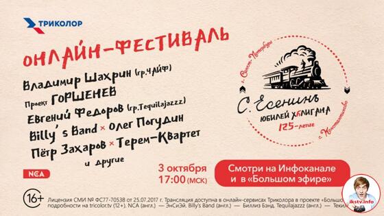 Музыкальный фестиваль «Юбилей Хулигана» в честь поэта русского поэта Сергея Есенина смогут посмотреть абоненты российского ТВ-оператора «Триколор». Об этом стало известно интернет-порталу «ИКС ТВ». Проект пройдет в честь 125-летия со дня рождения Есенина в формате поездки на «Виртуальном экспрессе». Он отправится по биографическому маршруту поэта из Санкт-Петербурга на его малую родину — село Константиново Рязанской области. Во время виртуального путешествия зрители увидят выступления известных артистов и музыкантов: Владимир Шахрин (группа Чайф), Проект «Горшенев», Евгений Федоров (группа Tequilajazzz), Billy’s Band, Олег Погудин, Петр Захаров, «Терем-квартет». Звезды исполнят современные версии произведений поэта. Начало передачи — 3 октября в 17.00. Напомним, что Князев заявил, что бой «КиШ» против «На-на» на ТВ был реальным. Полная версия материала доступна в «ИКС ТВ».