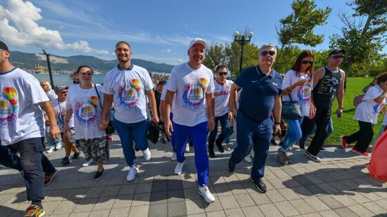 В этом году центральной площадкой главного спортивного праздника осени, Всероссийского дня ходьбы стал Новороссийск.С самого утра жители города целыми семьями и дружными компаниями направились к Мысу Любви – одному из самых узнаваемых мест города, где находится памятник «Экипажу сейнера «Уруп» и топиарий в форме рук, показывающих сердце. Согласно легенде, именно на этом месте в древние времена встречались влюбленные.3 октября здесь встретились люди, отдавшие свои сердца здоровому образу жизни. Первые приятные сюрпризы их ожидали еще до старта – каждому, кто зарегистрировался в качестве участника, вручали памятную футболку с символикой Всероссийского дня ходьбы. Дети и взрослые, бабушки и дедушки моментально облачились в белые майки, что только добавляло колорита. А роскошная, как по заказу, погода в Новороссийске – 24 градуса тепла и безоблачное небо — добавила настроения всем, кто решил пройти 2020 метров по красивой черноморской набережной.Под аккомпанемент громогласного Дмитрия Губерниева на сцене высадился мощный спортивный десант: бронзовый призер Олимпийских игр-2016 по парусному спорту Стефания Елфутина, олимпийский чемпион по дзюдо Беслан Мудранов, обладатель «золота» Игр-2004 в беге на 800 метров Юрий Борзаковский, олимпийские чемпионы по прыжкам на батуте Ирина Караваева и Александр Москаленко, победитель гандбольного турнира Игр-2000 Станислав Кулинченко, олимпийский чемпион по боксу Шамиль Сабиров, обладательницы бронзовых медалей Олимпийских игр по гандболу Людмила Пазич и Светлана Пряхина, многократная чемпионка мира по прыжкам на батуте Наталья Чернова, президент Федерации гандбола России Сергей Шишкарев.Праздник открыл президент Олимпийского комитета России, четырехкратный олимпийский чемпион Станислав Поздняков. Он пожелал всем участникам здоровья, бодрости духа и хорошего настроения, особенно в такой праздничный день:Я рад приветствовать всех на сегодняшнем празднике спорта и здорового образа жизни, главной площадкой которого в этом году стал город-герой Новороссийск.Сегодня прекрасная погода, идеальная для бодрой погудки вдоль моря. Конечно, мы знаем, что бывают здесь и совершенно другие сезоны, когда бора берет управление погодой в свои руки.Вот и в спорте сейчас период большой турбулентности. Из-за политических и экономических факторов, а также из-за пандемии коронавируса, отмены и переноса соревнований, неопределенности на ближайшее будущее.Именно поэтому то, что мы вместе с вами проводим сегодня День Ходьбы вызывает чувство радости и оптимизма.И, конечно же, символично, что главной площадкой этого Всероссийского спортивного праздника в год 75-летия великой победы стал город доблести и воинской славы.Здесь, на берегу Черного моря, в Цемесской бухте независимость нашей родины защищало не одно поколение предков. Сегодня мы чтим из память и благодарим за то, что имеем возможность строить нашу жизнь под мирным небом.Я благодарю от лица Олимпийского комитета России руководство города и региона за гостеприимство, президента Федерации гандбола Сергея Шишкарева за активное участие в организации этого мероприятия. И, конечно же, с особой радостью приветствую наших прославленных олимпийских чемпионов, которые сегодня здесь, вместе с нами. Многие из них родились на Краснодарской земле, поэтому