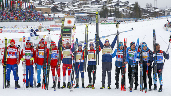 Эта награда стала седьмой для подопечных Елены Вяльбе, однако россияне так и не могут открыть счёт золотым медалям. Ключевым в гонке стал заключительный этап, на котором трёхкратный олимпийский чемпион норвежец Йоханнес Клэбо убежал в отрыв от Сергея Устюгова и принёс победу своей команде. Россияне уступили победителям 38,8 секунды. Третье место заняла команда Франции с отставанием 1.01,0 минуту.