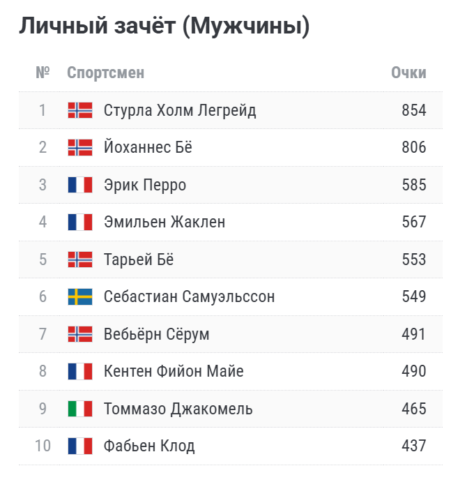 В мужском биатлоне до чемпионата мира ситуация казалась предсказуемой, но после гонок в Ленцерхайде всё перевернулось. В конце января казалось, что есть лидер – Стурла Легрейд (854 очка) – и есть списанный уже всеми чемпион-ветеран, доигрывающий роль звезды – Йоханнес Бё (806).