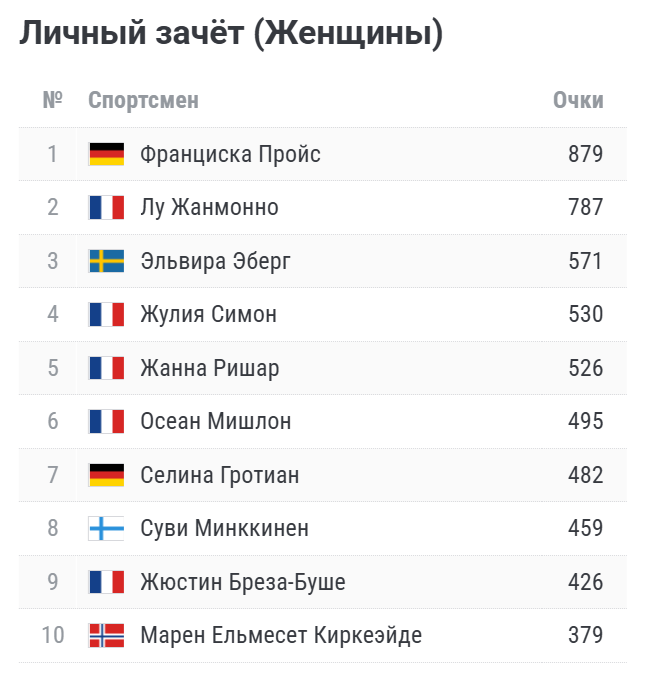 Лидерство там по-прежнему удерживает немка Франциска Пройс, в активе которой 879 очков. Январь она провела плодотворно, пусть у неё и случился и небольшой провал в результатах в Оберхофе. Лучшая немецкая спортсменка выиграла одно золото и по две серебряные и бронзовые награды.