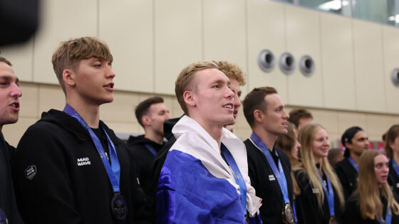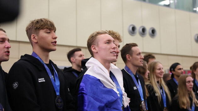 Российские спортсмены исполнили гимн страны после возвращения из Сингапура с чемпионата мира. Рылов приехал в аэропорт встречать пловцов