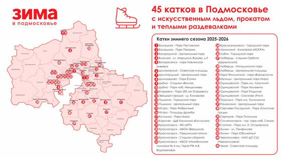 Андрей Воробьев отметил, что первые четыре катка уже начали работать в выходные дни: в Ленинском округе (у кинотеатра «Искра»), в Красногорске (на стадионе «Зоркий»), в Одинцовском округе (в деревне Сколково) и на территории спорткомплекса «Черноголовка». Еще 28 катков начали работу 1 декабря, а запуск оставшихся 13 объектов запланирован до конца декабря.