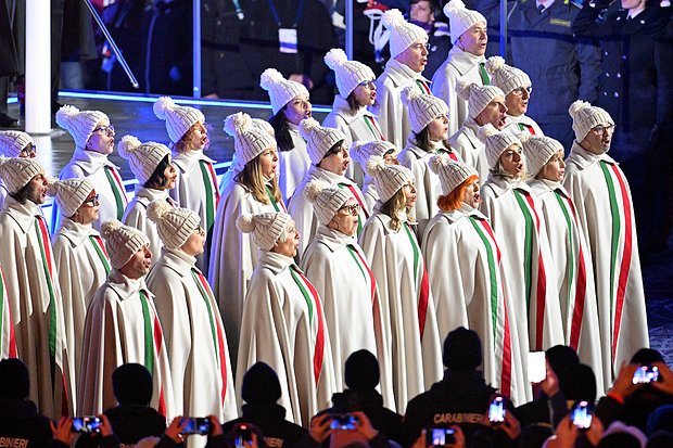 Пока на восьмидесятитысячном «Сан-Сиро» организаторы поражали зрителей размахом и разнообразием, в более камерной Кортина-д'Ампеццо было значительно спокойнее. Одним из ярких моментов церемонии в этом небольшом городке стало исполнение гимна Италии горным хором. Не могли оставить вас без этого кадра.