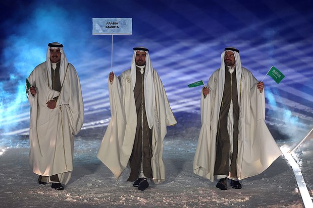 Россияне в параде участия не принимали. Но посмотреть все равно было на кого. По традиции, повышенное внимание было приковано к делегациям стран, не славящихся достижениями в зимних видах спорта. Оцените костюмы сборной Саудовской Аравии.