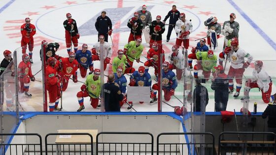 Сегодня в Москве на «ЦСКА-Арене» состоялась открытая тренировка сборной России в преддверии Кубка Первого канала. Напомним, команда Алексея Жамнова сыграет на домашнем турнире со сборными Беларуси и Казахстана. Это единственная пауза в нынешнем регулярном чемпионате КХЛ.