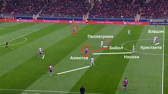 Почему «армейцы» снова уступили «Роме». Гончаренко исправил старые проблемы. Появились новые Гончаренко не стал мудрить со схемами и выбрал хорошо знакомую 3-5-2. Во избежание разрывов между линиями тренер ЦСКА применил жёсткие персональные ориентировки при высоком прессинге: Чалов и Сигурдссон играли по центральным защитникам «Ромы», Фернандес (и заменивший его на 12-й минуте Щенников) с Обляковым – по крайним защитникам, Влашич и Ахметов – по центральным полузащитникам, Бийол по Пеллегрини, а центральные защитники выдвигались за крайними нападающими даже на чужую половину поля. Но персональные ориентировки чреваты тем, что из-за индивидуальных недоработок страдает вся команда. Так, например, Влашич уже на третьей минуте забыл про Нзонзи и дал пройти передаче на него, из-за чего «Рома» легко вышла из-под прессинга. На скриншоте хорошо видна не только недоработка Влашича, но и высокий персонально-ориентированный прессинг ЦСКА, в том числе и поднявшегося за Клюйвертом Набабкина. Когда ЦСКА садился на свою треть и выключал прессинг, персональные ориентировки тоже уходили; но, обороняясь глубоко, «армейцы» сохраняли компактность – римляне не могли воспользоваться разрывами между линий и зонами в полуфлангах, как в первом матче: их не было. Как правило, ЦСКА просто закрывал «Рому» на фланге. Итог – за первый тайм московского матча команда Ди Франческо сделала гораздо меньше касаний в опорной зоне красно-синих, чем в первом тайме в Риме. В целом «армейцы» выиграли тайм по ударам (7-6 и всего 2 удара с игры у «Ромы» против 5 у ЦСКА). Как атаковал ЦСКА. Почему контроль тайма не вылился в множество моментов Возможно, быстрый гол «Ромы» поменял планы Ди Франческо на игру, но это маловероятно: до забитого мяча римляне всё равно прессинговали не так высоко, как в матче двухнедельной давности. Главное изменение – в позиции центральных полузащитников при начале атак «армейцев»: теперь Нзонзи и Кристанте (в Риме вместо второго играл Де Росси) изначально занимали более глубокую позицию и не выдёргивались в прессинг. Так Ди Франческо решил проблему с разрывами между линий при прессинге, которыми ЦСКА пользовался в прошлый раз. Гончаренко же придумал ход против прессинга, которого почти не было: Ахметов постоянно опускался глубже, чтобы начать атаки, при этом Бийол зачастую оставался с Ильзатом на одной линии. У ЦСКА появлялось преимущество против Пеллегрини в своей опорной зоне, но при этом в центре поля «армейцы» имели либо одинокого Влашича, либо вообще никого, если хорват принимал решение уйти на одну линию к Чалову и Сигурдссону. Такой ход периодически становился проблемой для ЦСКА: подборы после длинных передач, которые предпочитает Акинфеев, собирать было некому, а для продвижения мяча через центр не хватало игроков. Основной план атаки ЦСКА на чужой трети – взламывание левого полуфланга: там на дриблинге тащил мяч Влашич, туда смещались Чалов и Сигурдссон. Правда, «Рома» была к этому готова: игроки Ди Франческо насыщали полуфланг и фланг, создавая численное преимущество. Влашич в левом полуфланге вообще был под конвоем из двух игроков; по левому крайнему защитнику ЦСКА здорово отрабатывал Флоренци. Такой перекос «Ромы» на один фланг, само собой, создавал возможности для диагональных переводов под изоляцию противоположного крайнег