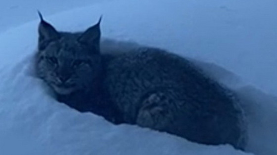 В соцсетях появилось видео, снятое семьёй из тюменского района Антипино. На кадрах хорошо видно рысь, спрятавшуюся в сугробе. После того, как люди привлекли внимание животного, оно несколько секунд смотрело в камеру, а затем решило удалиться.