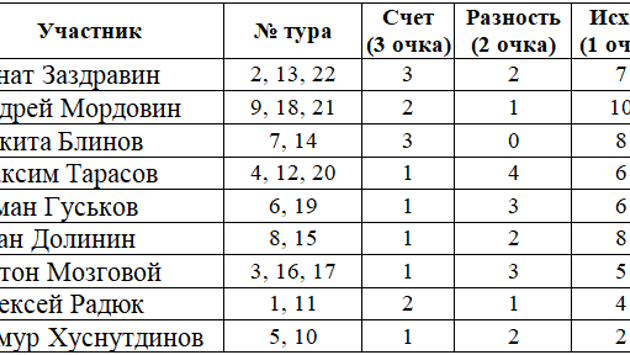 верно предсказал точный счет в матче "Сочи" - "Крылья Советов" (1:2), разницу голов в игре ЦСКА - "Химки" и победу "Ахмата" над "Уралом", благодаря чему добавил в свою копилку 6 очков. Это позволило ему набрать 20 суммарных баллов и выйти на чистое первое место в общем зачете. На второй строчке с 18 очками находится