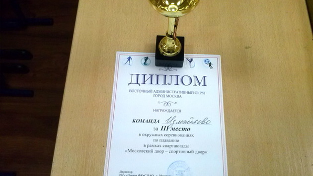 Центр культуры и спорта «Измайлово» в очередной раз смог поздравить своих воспитанников. Сборная Центра 30 сентября заняла третье место в соревнованиях ВАО по плаванию. Эти соревнования проводились в рамках городской Спартакиады «Московский двор - спортивный двор». Совместные усилия спортсменов позволили команде занять почетное третье место. В сборную вошли и принесли ей такой результат Головкин Константин, Минашкин Александр, Лупин Максим, Самсонова Анастасия, Салдадзе Тариэл, Николаева Татьяна, Хробостов Алексей. Заплыв принял ФОК «Касатка» на улице Молостовых. Его сборная заняла первое место, на втором – район Ивановское. Победители и призеры смогли получить заслуженные кубки и медали. Самые лучшие поедут выступать на общегородских соревнованиях.